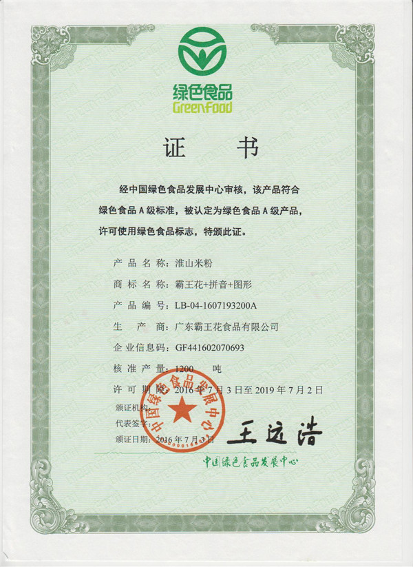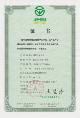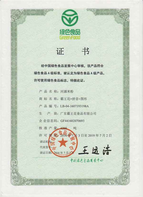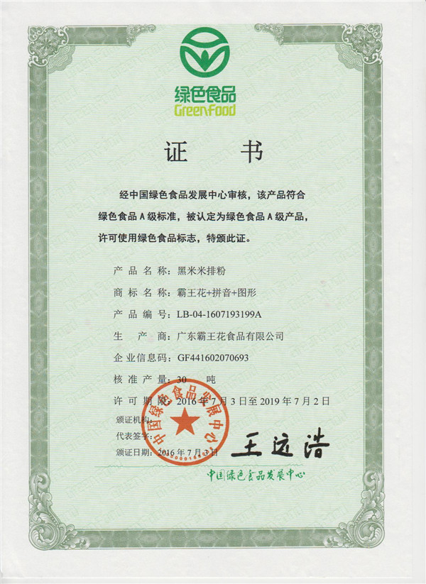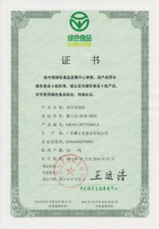 經(jīng)中國綠色食品發(fā)展中心審核,該產(chǎn)品符合綠色食品A級標(biāo)準(zhǔn)。被認(rèn)定為綠色食品A級產(chǎn)品,許可使用綠色食品標(biāo)志,特頒此證。