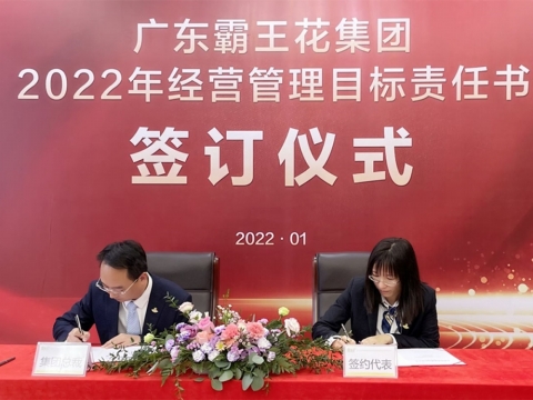 2022年1月21日,廣東霸王花集團2022年度工作會議暨2022年度經營管理目標責任書簽約儀式在集團本部多功能會議室舉行。集團董事長朱日楊、總裁朱榮業、黨委書記羅友望、副總裁陳駿良、副總裁兼財務總監朱利昀出席了會議及簽約儀式。參加會議的還有集團投資發展部總經理黃冠、霸王花食品公司總經理熊傳軍、旺源房地產公司常務副總經理陳永輝、新河實驗學校總校常務副校長謝輝華、旺源典當公司總經理朱禮彬、新河實驗學校附屬第一幼兒園園長葉海燕、德康醫院院長解小會、德康醫院副院長(集團派駐德康醫院管理代表)葉海濤,以及集團本部各職能部門負責人、各下屬子公司部門負責人及以上人員。年度工作會議及簽約儀式由集團副總裁陳駿良主持。